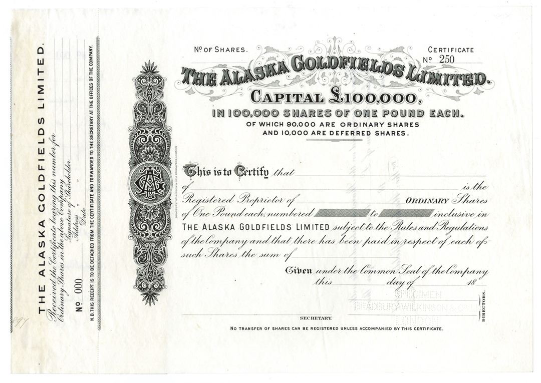 Alaska (Incorporated and Issued in England). Odd Shares Ordinary Stock Specimen Certificate, Black print with simple black design at left border, Ornate company title at top, Pin punched cancelled, VF-XF condition, Bradbury, Wilkinson & Co.