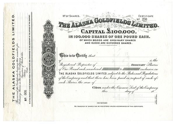 England. Odd Shares Ordinary Stock Specimen Certificate, Black print with simple black design at left border, Ornate company title at top, Pin punched cancelled, VF-XF condition, Bradbury, Wilkinson & Co.