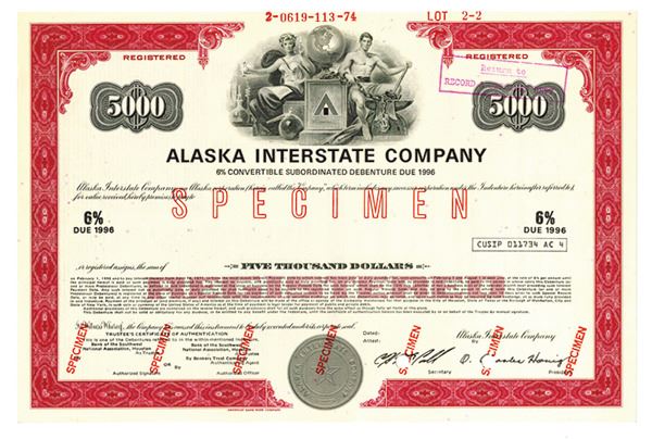 Alaska. $5000 Specimen 6% Convertible Subordinated Debenture Registered Bond, Black print on red border and under tint, Allegorical figures sitting together with globe and company logo between them, Multiple specimen overprints and POC's, VF-XF condition, ABNC.