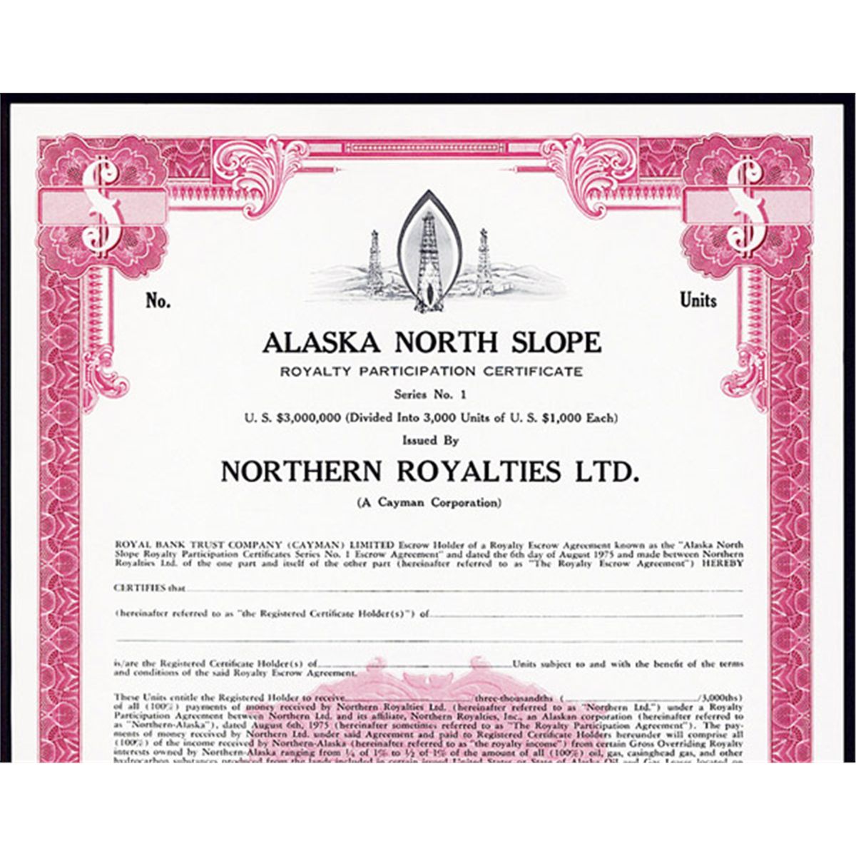 Alaska, 1975, (A Cayman Corporation) Vertical $-Odd, Royalty Participation Certificate specimen bond, purple border with oil rigs vignette, specimen imprints, XF. SCBNC.
