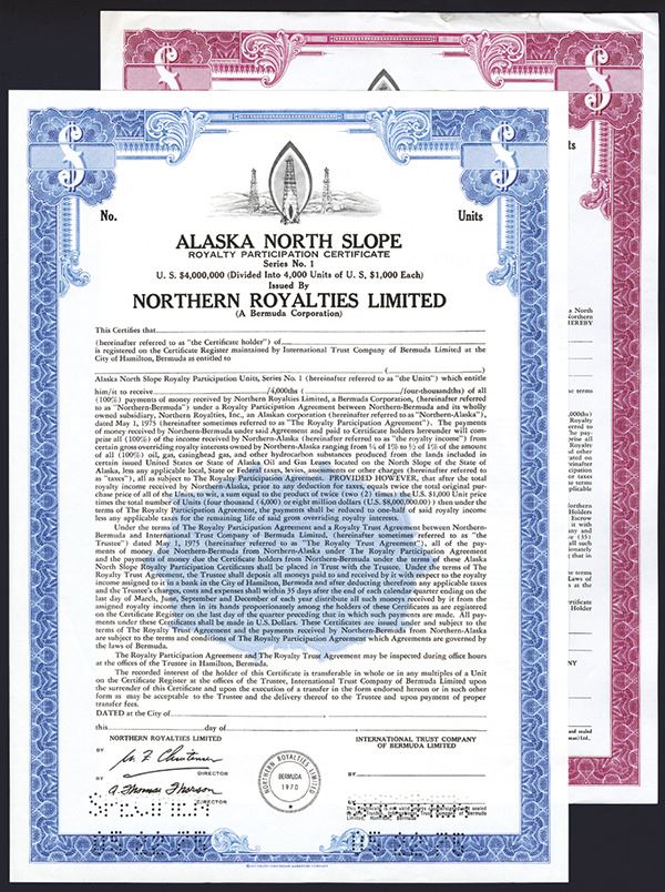 Alaska, 1975. Unspecified amount of units. Bermuda Incorporated, Black on blue border and underprint, SCBNC. Scarce Alaska oil certificate. SCBNC.