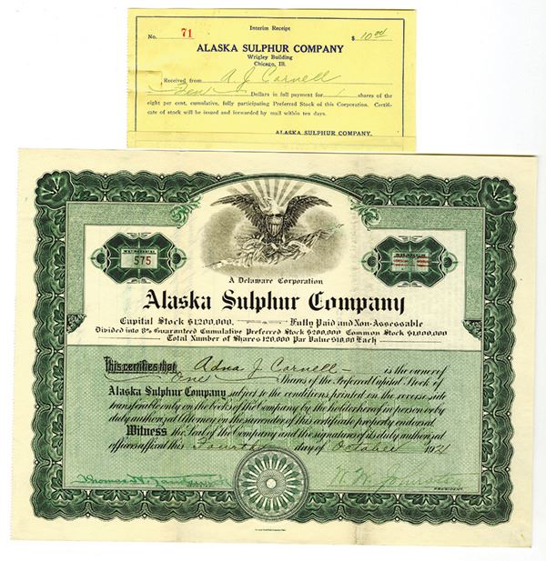 Alaska Lot includes 2 pieces: 1 Share I/U Preferred Capital Stock Certificate in green; $10 I/U 8% Preferred Stock Interim Receipt #71 on yellow paper.