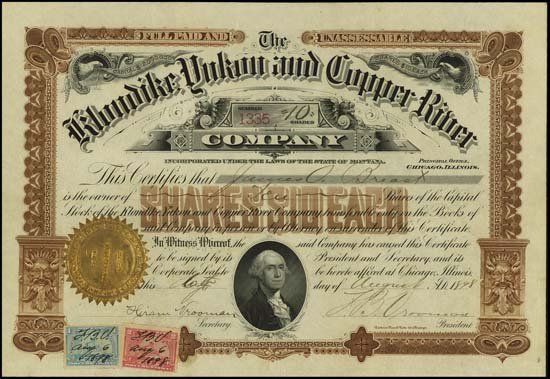 1898. 10 Shares. Issued and uncancelled stock. Brown border. George Washington on bottom with eagles on upper left and right. XF condition. Incorporated in Montana. Western BNC. Rare Alaska mining stock.