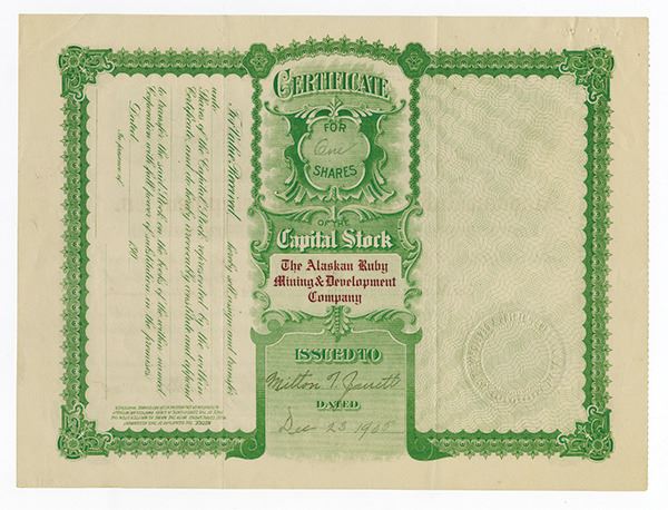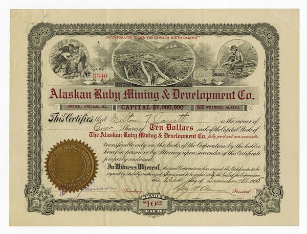 Alaska. (Mines near Wrangle, Alaska). (Incorporated in South Dakota), 1905. 1 Share. I/U stock. Black border. Miners working on left & right with sluice vignette. XF condition. Goes style certificate. Rare Alaskan mining certificate.