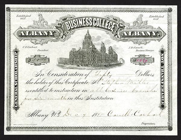 Albany, New York, $50, I/U, 6 Month Tuition certificate, Black with no underprint, College building at center under title, signed by Carnell E. Carhart as president, VF condition. First time seen by cataloger.