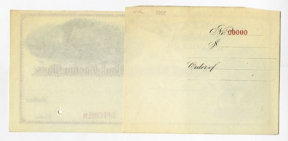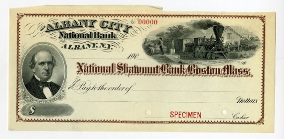 New York & Massachusetts, 1901. Specimen Check with black and brown printing and brown border, Portrait of man at left and locomotive at station at right, S/N 00000, Specimen overprint and POCs, VF to XF condition. NBNC. Albany City National Bank operated the regulations of the National Banking Act. The bank provided various banking services to individuals and businesses in the Albany area, including handling deposits and loans. It played a role in the local economy before eventually becoming part of broader industry consolidation. The corresponding bank was the National Shawmut Bank of Boston. It was an influential financial institution in Boston, it offered various banking services and played a key role in the region's financial sector. In 1960, it merged with the Boston Safe Deposit and Trust Company to form the Shawmut Corporation, which later became part of Bank of America in the early 1990s.