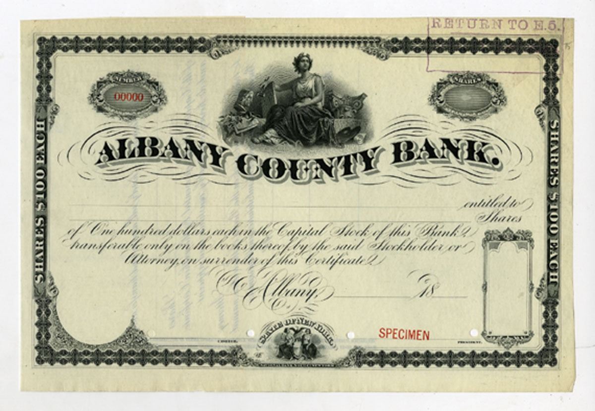 New York…., ND (ca.1860-70s). Specimen Stock Certificate, Black print on black border, Allegorical woman at top with seal of New York at bottom, Specimen overprint and POCs, VF-XF condition with toning at top right corner, NBNC.