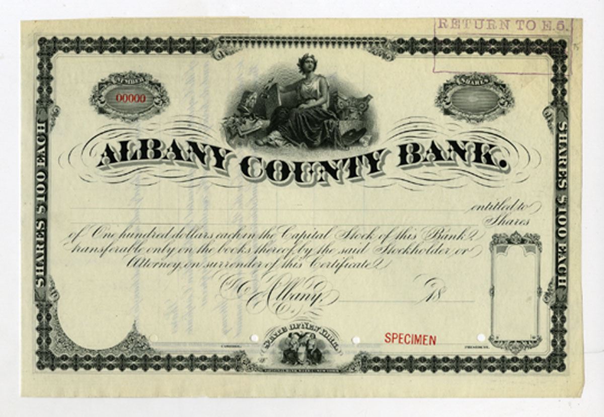 New York…., ND (ca.1860-70s). Specimen Stock Certificate, Black print on black border, Allegorical woman at top with seal of New York at bottom, Specimen overprint and POCs, VF-XF condition with toning at top right corner, NBNC.