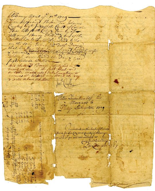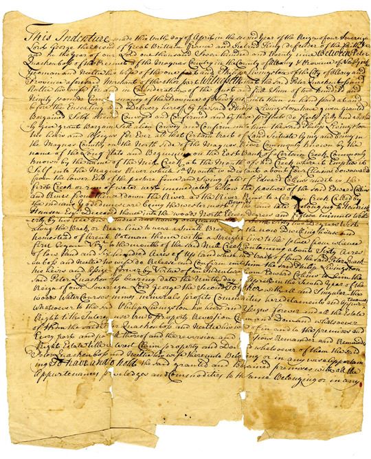 Albany, Province of New York, 1729. Handwritten legal document regarding an indenture between Peter Quackenboss (Quackenbush), his wife Nettie, and Philip Livingston, in which Livingston mortgaged a tract of land, described in great detail throughout. Outlined in the document are the terms and conditions of the indenture, with listed witnesses, all made in the "Second year of the Reign of our Sovereign, Lord George the Second of Great Britain, France and Ireland, King defender of the faith." The Philip Livingston discussed throughout the piece and bearing his signature is likely Philip Livingston (July 9, 1686 - February 11, 1749), the son of Robert Livingston the Elder, and elder brother of Robert Livingston of Clermont. Philip was the second Lord of Livingston Manor, a merchant, and slave trader. Philip Livingston was the fourth child and second son of Robert Livingston and Alida (nee Schuyler) van Rensselaer Livingston. He was born on July 9, 1686 in his father's Albany, New York town house, at "Elm Tree Corner", the intersection of State and Pearl Streets and one of early Albany's principal crossroads. The name commemorates a legendary elm tree that reputedly was planted in 1735 by a young Philip Livingston in front of his father's house on the northwestern corner. Something of an Albany landmark, the old elm was removed in June 1877. At the time of Philip's birth, his father was downriver in New York engaged in persuading Governor Dongan to grant a city charter to Albany. Philip was named for his maternal grandfather, Philip Pieterse Schuyler. His son, Philip Livingston (January 15, 1716 Ð June 12, 1778), was an American merchant and statesman from New York City. He represented New York at the October 1774 First Continental Congress, where he favored imposing economic sanctions upon Great Britain as a way of pressuring the British Parliament to repeal the Intolerable Acts. He was also a delegate to the Second Continental Congress from 1775 to 1778, and signed the Declaration of Independence. VG to Fine condition with some staining and edge damage but in incredible condition considering its age. Fascinating and unique piece of early New York Colonial History, which predates the American Revolution by almost half a century.