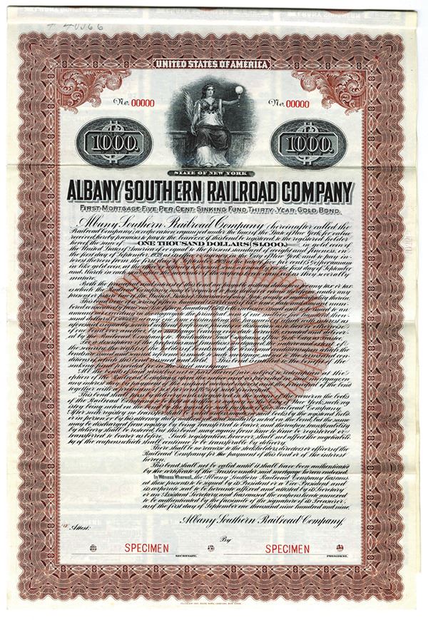 New York. $1000 Specimen 5% 1st Mortgage Sinking Fund Gold Coupon Bond, Black print with an ornate red/brown border and under tint, Image of a seated allegorical figure at top, Specimen overprints, POC's, VF-XF condition, FLBNC, Unlisted at a Bond on Cox.