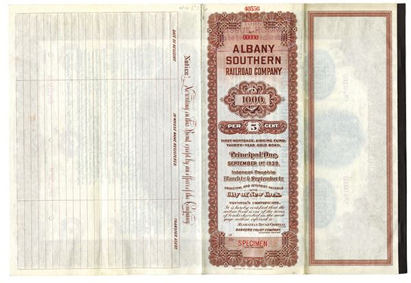 New York. $1000 Specimen 5% 1st Mortgage Sinking Fund Gold Coupon Bond, Black print with an ornate red/brown border and under tint, Image of a seated allegorical figure at top, Specimen overprints, POC's, VF-XF condition, FLBNC, Unlisted at a Bond on Cox.