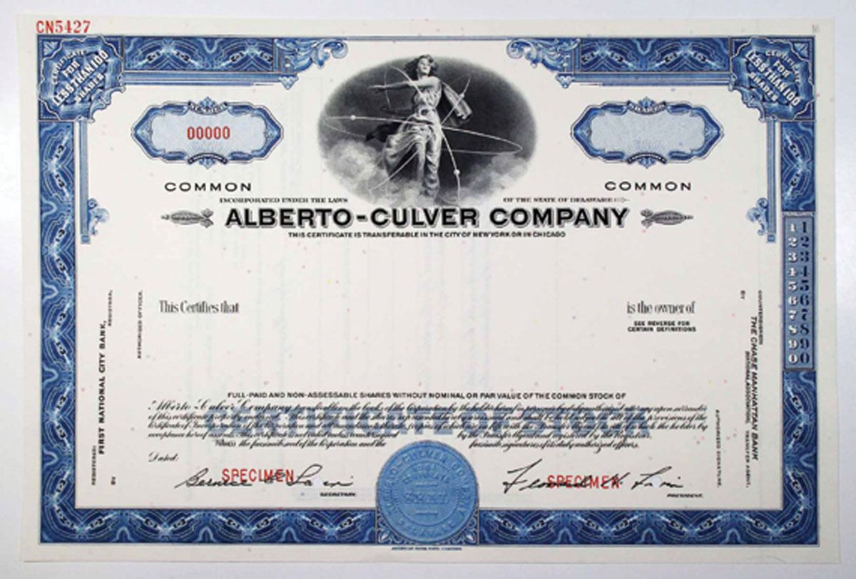 Alberto-Culver Co., 1940s <100 Shrs Specimen Stock Cert., VF-XF ABN Blue. Alberto-Culver was an American corporation with international sales whose principal business was manufacturing hair and skin beauty care products under such brands as Alberto VO5, Andrew Collnge, St. Ives (skin care products), TRESemmé, FDS, Consort, Nexxus, and White Rain.