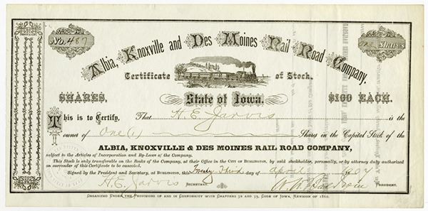Iowa. 1 Share Capital Stock Issued Certificate, Black print no simple black border, Small image of locomotive at top center under company tile, VF-XF condition.