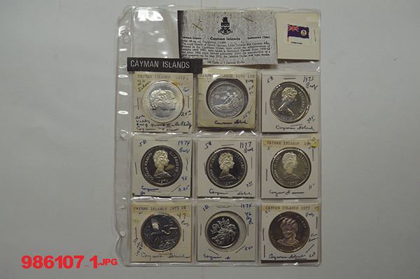 Cambodia (10) Includes a 2 ticals of 1847, holed; Cayenne (French Guiana) 1798 2 Sous (2, one a nice VF); Cayman Islands (52) includes 15 silver crowns three of which are in 1974 Franklin Mint proof set in card and an additional 37 minors; Central American Republic (8) including a 1824 and holed 1839 8 Reales. Generally Very Good to Very Fine, some quite better. Just over 70 pieces.