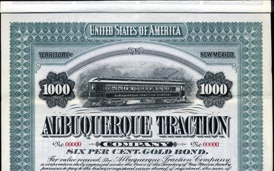 Albuquerque, New Mexico Territory. 1905. $1,000. Specimen 6% Gold bond. Green border. Inter-urban street car with title of company on side. XF condition. Red specimen overprints, POC's and "00000" serial numbers. Coupons attached. If this was a national banknote. it would sell in the high 4 figures. Extremely rare New Mexico Territory certificate. ABNC.