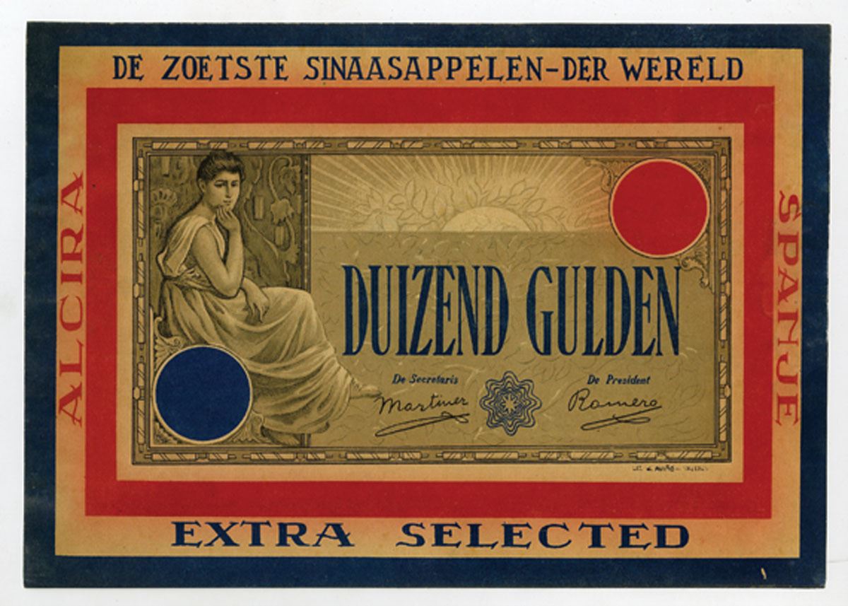 Netherlands, ND (ca.1920s). Crate Label printed in Black red and blue with seated woman at center, "The Sweetest Oranges in the World" printed in Dutch at top center, VF to XF condition.
