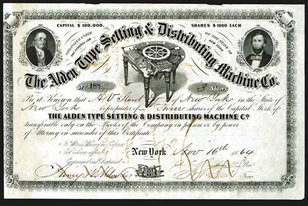 New York, 1863, 1 Share, Type setting machine, Franklin left, Alden right, Revenue stamp affixed, Serial #188, Pen notations and cancels, light stains in left border, otherwise VF. Signed by Alden as secretary.
