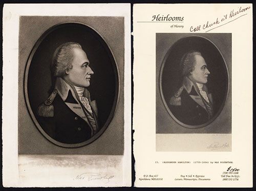 Philadelphia, ND (ca.1900), Max Rosenthal Mezzotint engraved portrait of Alexander Hamilton, Proof printed in black and gray, 5.8 by 8.5 inches, Pencil autograph of Max Rosenthal on bottom right, no name engraved on plate on lower right border, Choice Extremely Fine, Max Rosenthal was a prominent Philadelphia engraver-artist originally from Russia but was brought over as an apprentice Lithographic assistant to a well known French Lithographer in 1849. This proof is one of 25 signed proofs by Max Rosenthal. Renowned engraver signed historic artwork.