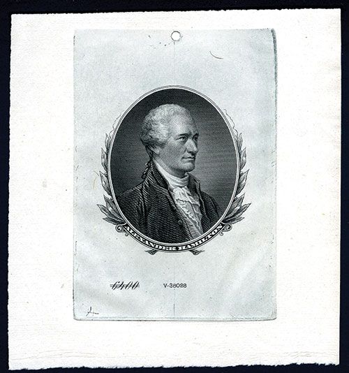 ND (ca.1860-90's), 4.25 x 4.5 inches, Large Die Proof printed in black on india type of paper, Plate # 6400 crossed out and new plate # V-38028 added. Leaves surrond bottom to 3/4 of the top oval borders, Hamilton facing right. CU condition. ABNC. Hamilton was the first Secretary of the Treasury.