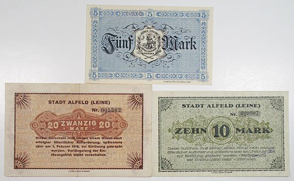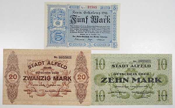 Germany. Lot of 3 notes, includes a pair of 10 Mark and 20 Mark from Stadt Alfeld; and a 5 Mark from Kreis Erkelenz. VF to XF. (3)