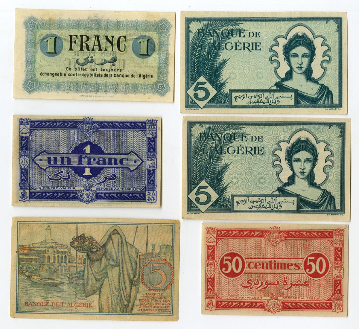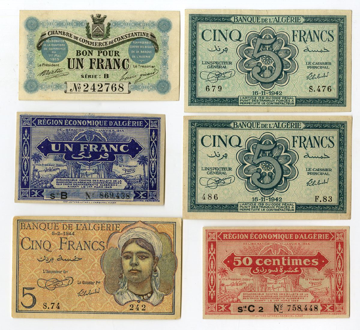 Algeria, 1915-49. Lot of 6 Issued Banknotes, Includes: Chambre de Commerce de Constantine 1 Franc, 1915; Banque de l'Algerie 5 Francs (2), 1942 and 5 Francs, 1944; Region Economique d'Algerie 50 Cents, 1949 and 1 Franc, 1949. Notes are in AU to UNC condition. (6).