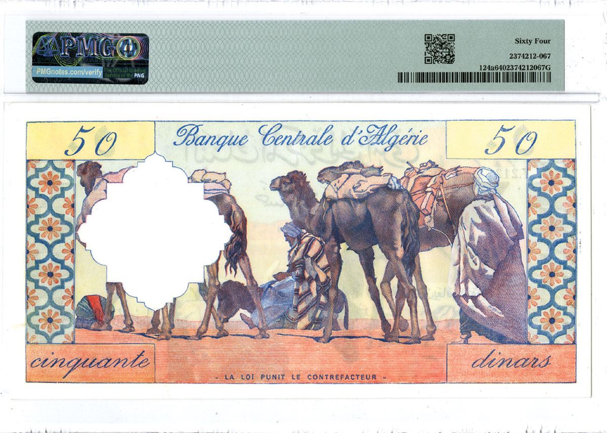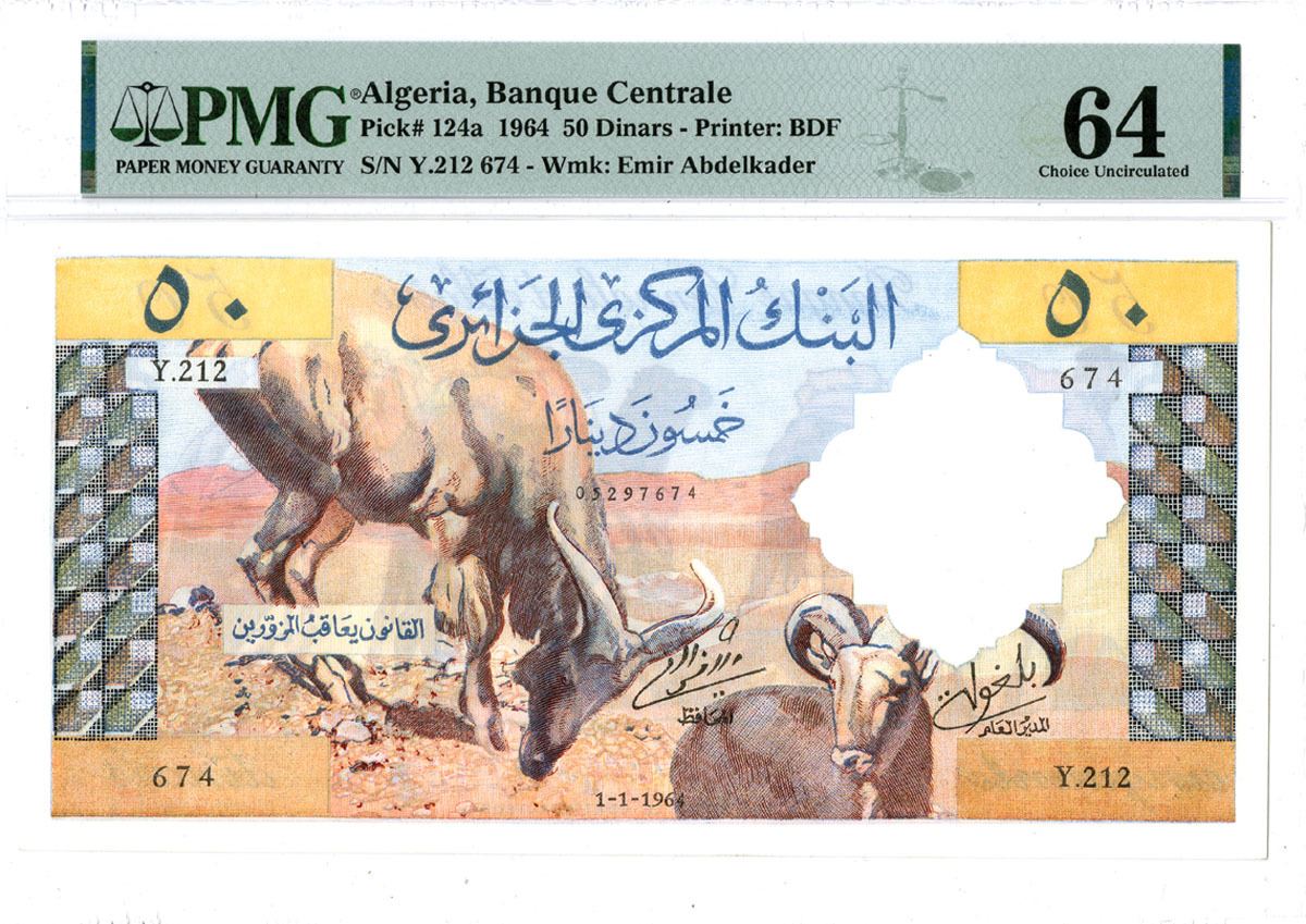 Algeria, 1964. 50 Dinars, P-124a, Issued Banknote, Light brown and m/c printing, Mountain sheep on face and m/c camel caravan on back, S/N Y.212 674, PMG graded Choice Uncirculated 64, BDF.