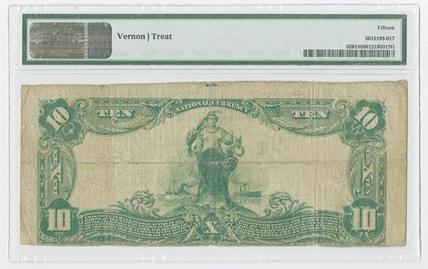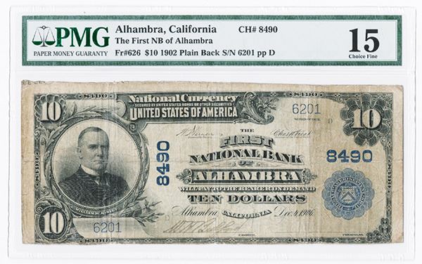 Alhambra, CA. $10 1902 PB, Blue Seal, S/N 6201, Vernon | Treat signatures, PMG graded Choice Fine 15, touching on bottom with 3 large margins on sides and top. 6 large size notes are known on this bank, this example is tied with one other for finest known of the 4 $10 notes known. Rare and desirable California National.