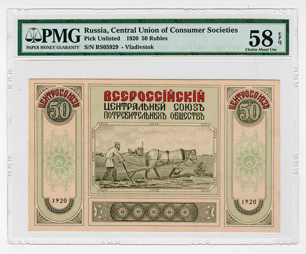 Russia. 50 Rubles, P-Unlisted, Black, light green, beige and red design with hands shaking on top middle, back with man plowing fields, PMG graded Choice About Uncirculated 58 EPQ. Attractive and rare note.