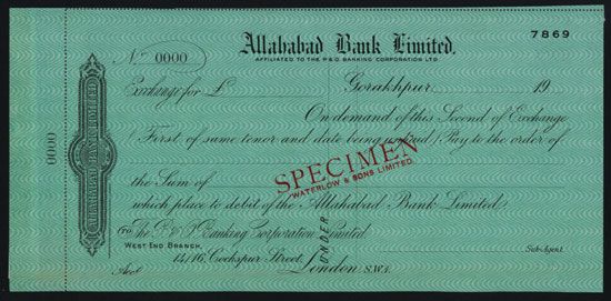 Gorakhpur, India, 19xx (ca.1910-20), Specimen 2nd of Exchange, Black on green underprint, Red Specimen overprints, S/N 0000, Bank # 7869, Payable at P&O Banking Corp. in London, hinge reinforcement on perforated margins that could be removed if desired, otherwise the exchange appears Uncirculated. W&S.