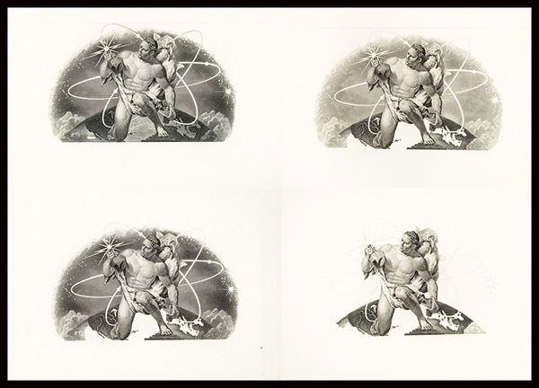 New York, NY , 1982, Group of 4 Large Die Proof Vignettes titled ABNC. Stock in 4 different stages of engraving. All are printed in black on india on large white card with notations and dates from 1-15-82; 2-17-82; 6-24-82 and the final engraving dated 8-5-82. Evidently there were additional stages, but there are only 4 in this group that was found. All are in Choice Uncirculated condition. ABNC.