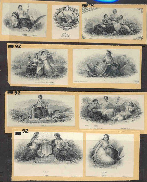 ca.1850's-1860's. 15 different allegorical patriotic female proof vignettes. Most of these images were used on obsolete banknotes, stocks, bonds, checks and security printed documents. The vignettes range from 2 to 3 inches in size. Titles include "Union" with the balance untitled. All are printed on india paper and mounted to large archival manila cards. Printers include ABNC; NBNC; RWHE; CBNC; TCC; DWC and the others unattributed. All are in Fine to choice uncirculated condition. Please inspect. Extremely attractive and diverse group of Patriotic female allegorical vignettes with some well known images.