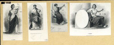 ca.1850's-70's. 14 different proof vignettes printed on india paper and mounted on 5 different production department manila file envelopes. 9 are "Justice" or "Equity" with scales vignettes and 5 are various others including "Geographical Science"; "Science"; "Record of Civilization"; "Inspiration" and one unattributed. "Inspiration" is in 2 different versions, one without crown and no title, and one with a crown and "Inspiration" title. "Inspiration also has a nice bunion for all you Podiatrists out there. Possibly the earliest artist rendition of a bunion seen. Printers include ABNC; DBC; CBNC; RWHE and NBNC. All in VF to XF condition. Scarce group of rare vignettes.