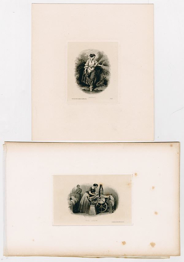 Lot of 2 proof vignettes printed on india paper on large card, "The Loom" and "Harvest". The first has some light age spots, mainly on the card. National BNC and American BNC.