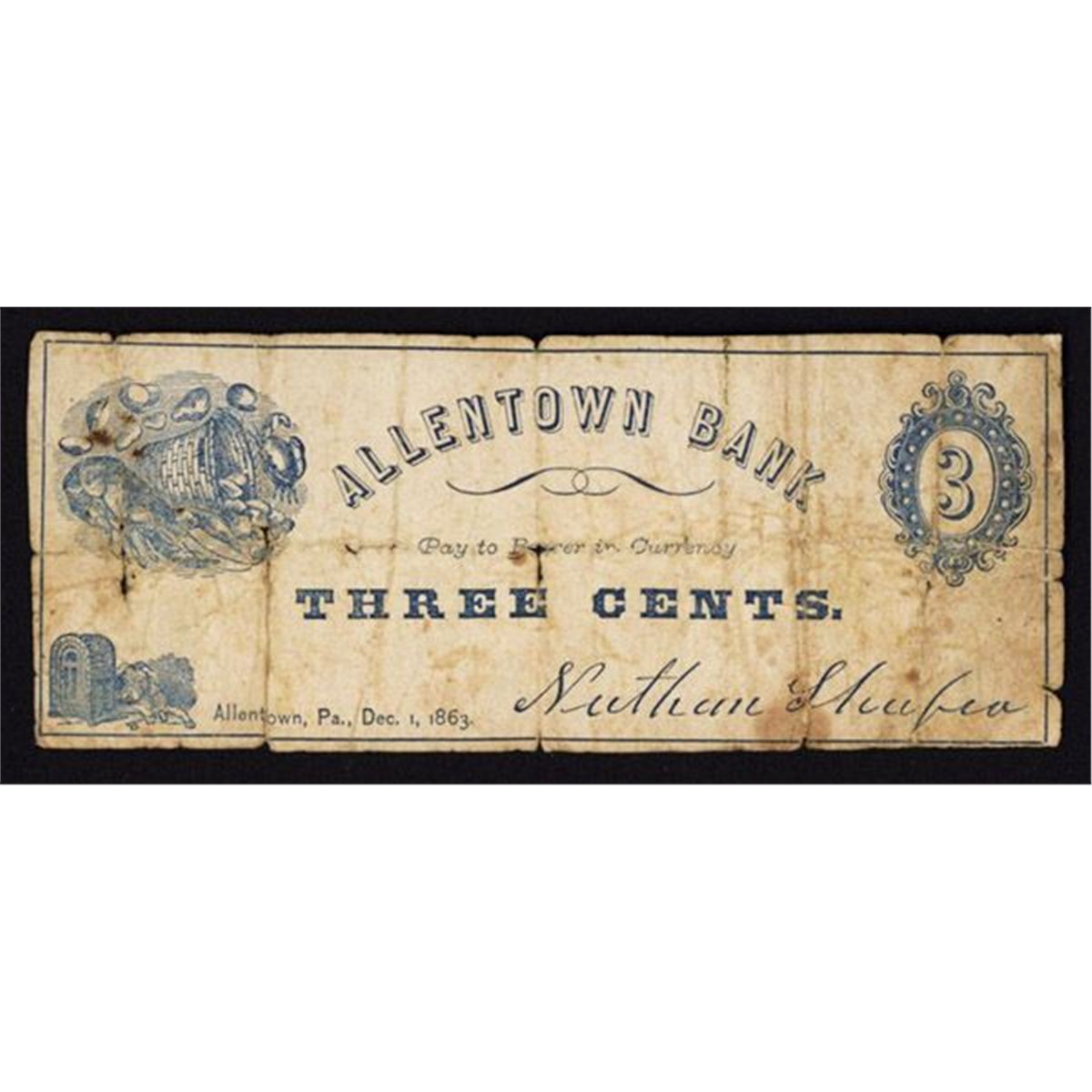 Allentown, PA, Dec. 1, 1863, 3cts, Issued scrip note, Blue with basket of spilled seafood including lobsters, clams, oysters and crabs on left, Numeral 3 counter on right with dog by safe on bottom left, Small reinforced tear on the bottom left margin, small hole in middle, overall a nice VG with small faults, but still a very scarce scrip note.