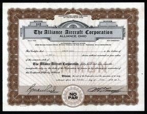 Alliance, Ohio. 1928. 1 Share. Issued and uncancelled stock. Brown with ornate title, no vignettes. #102. VF condition. In late 1920s made Argo 3-seat biplane and Hess Warrior 7-cylinder radial engine of 115 hp. Scarce early aviation company.