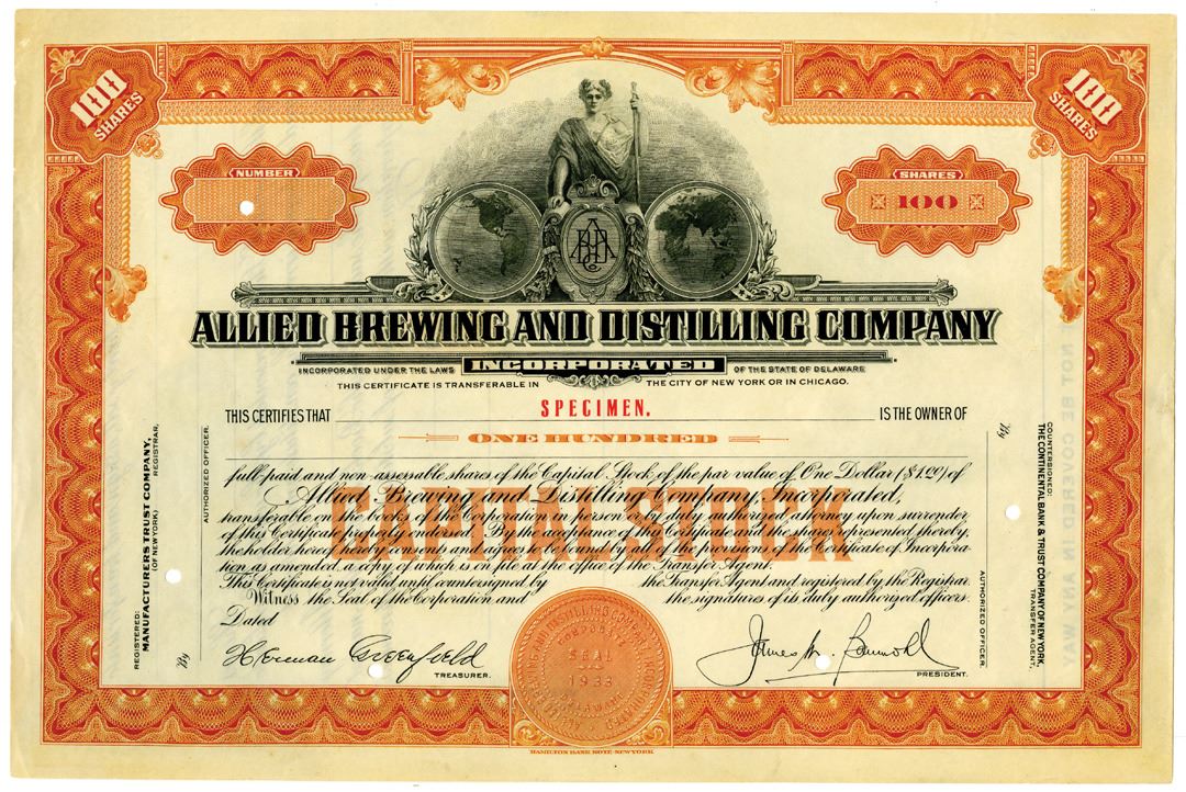 Delaware, ND (1930-50s). 100 Shares Specimen Capital Stock Certificate, Black text with orange border and underprint, Allegorical figure with company seal at top center. Red specimen overprint and POCs. Fine-VF condition with some toning, HBN.
