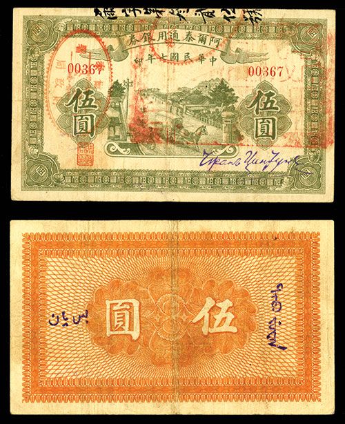 5 Yuan, P-S2409K (S/M#O3-2), Issued banknote, Olive green, horse drawn wagon with people at center, Red oval overprint top middle and left side, Red seals, back orange, S/N 00367, PMG graded Very Fine 25 with claims to Choice VF, rare note seldom seen at auction with large even margins and firm paper with only a little rough handling on the right edge keeping this note from XF condition.