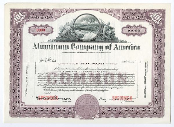 Pennsylvania. 10000 Shares Common Stock Specimen Certificate, Black print on purple border and under tint, Allegorical figures flanking image of waterfall at top, Specimen overprints and POC's, VF-XF condition, SBNC