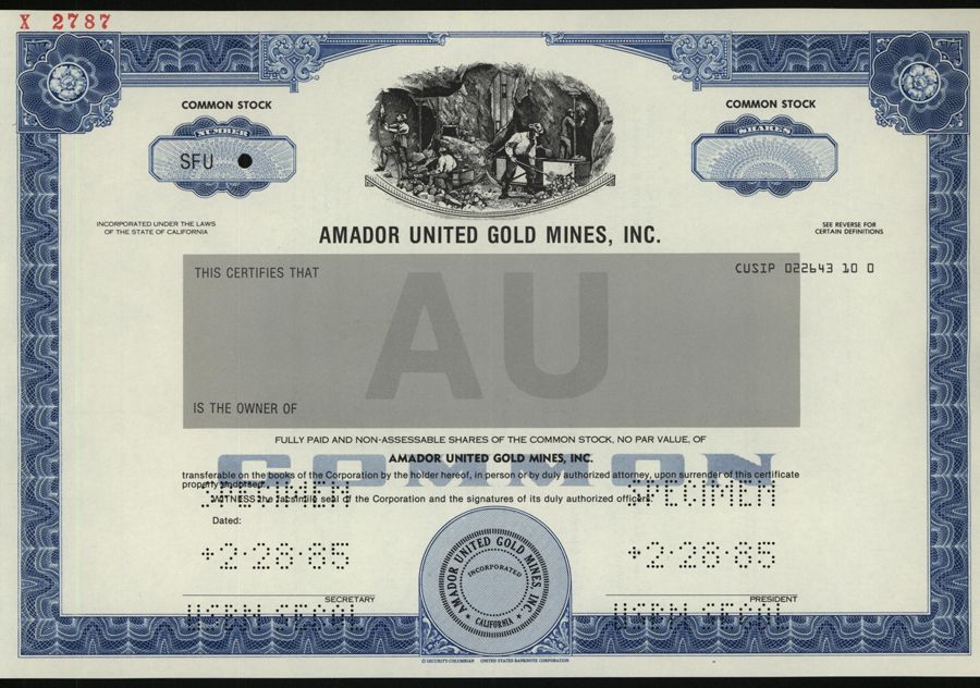 California, 1985, Pin-punch Specimen Stock, Odd Shares, Black on blue border and underprint, Mining vignette top center, VF-XF condition, SCUSBNC.