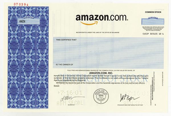 Delaware, Odd Shares, Common Stock, Specimen Stock Certificate, Black title with blue end panel and undertint, Jeff Bezos Facsimile Signature, XF/Uncirculated, Rare modern business history of historic company. SC-USBN/ABNC. Rare specimen stock certificate.