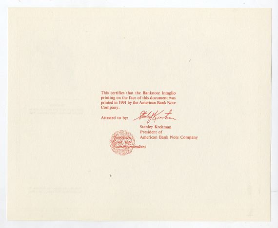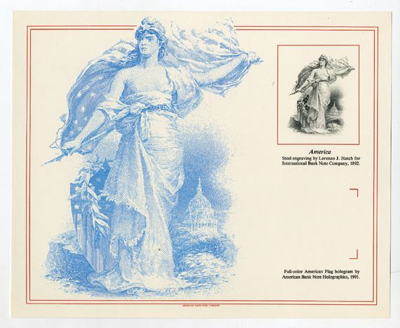 Lot of 40+ Souvenir Cards of "America" 1991 reprints of the steel engraving by Lorenzo J. Hatch for International Bank Note Co. in 1892, all are Uncirculated as printed. ABNC. (41). Sold "AS IS" no returns accepted.