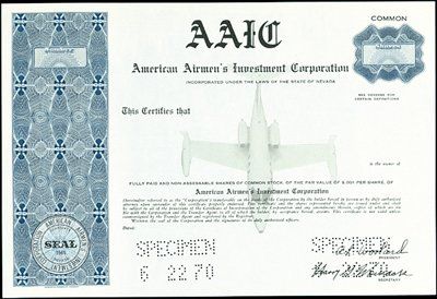 NV. 1970. Specimen. Odd shs, Blue. Common Stock. Photograph of Lear Jet. Rare. Federated BNC. XF.