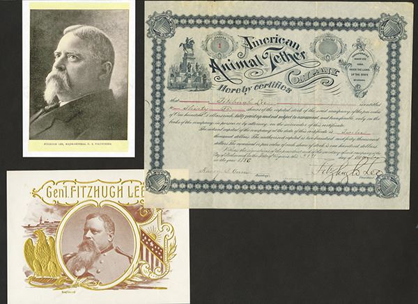 Richmond, VA., 30 Shares, I/U, S/N 1, ITASB Civil War Confederate General Fitzhugh Lee as president. VF condition. Lee was a Confederate cavalry general in the American Civil War, the 40th Governor of Virginia, diplomat, and United States Army general in the Spanish_American War. He was the son of Sydney Smith Lee, a captain in the Confederate States Navy, and the nephew of General Robert E. Lee. Scarce Civil War Signature on stock certificate. Also includes photograph and cigar label with Fitzhugh Lee's photograph.
