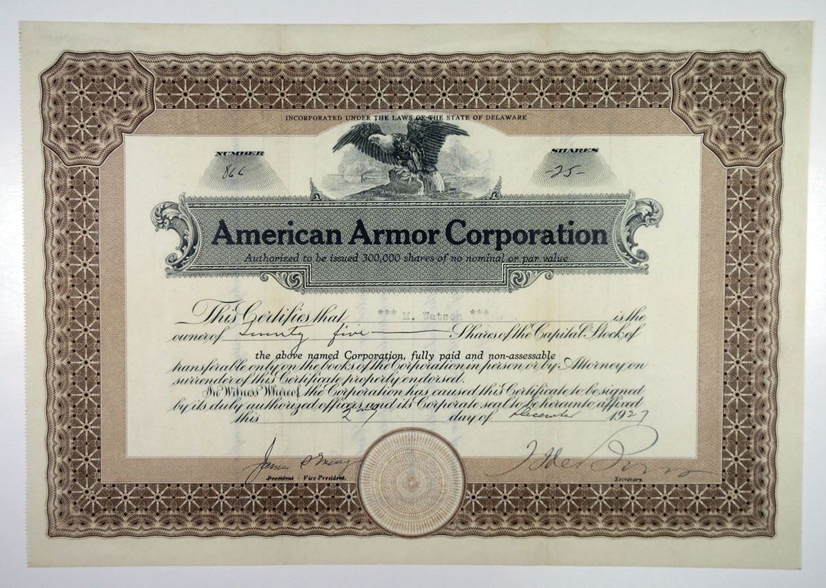 American Armor Corp., 1927 25 Shrs Stock I/U Stock Certificate, XF, The company made bullet proof clothes. Patent was filed March of 1924 by inventor Bernard Spooner. "This invention relates to improvements in bullet-proof armor adapted for shielding persons and objects subjected to the hazard and danger of n fire. The principal object of the invention is to provide a shield for the body that can be worn under the ordinary outer clothing of an individual in an unobtrusive manner and which is sufficiently light in weight and also flexible as to avoid discomfort and at the same time effectually protect the wearer from injury due to the impact of a bullet."