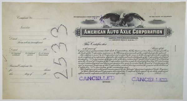 Delaware, ND (1920-30s). Odd Shares Progress Proof Capital Stock Certificate, Black text with eagle at top center. Cancelled stamps at bottom, writing at left in black ink. Fine condition.