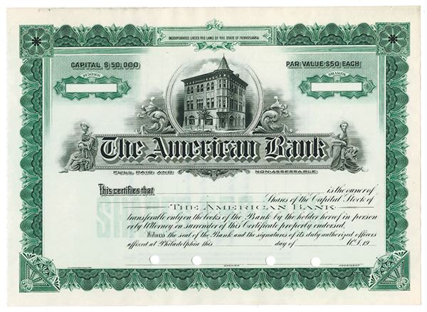 Pennsylvania. Odd Shares Capital Stock Specimen Certificate, Black print on green border and under tint, Company title at center with building above, POC's at bottom, Fine-VF condition with toning at edges, SBNC.