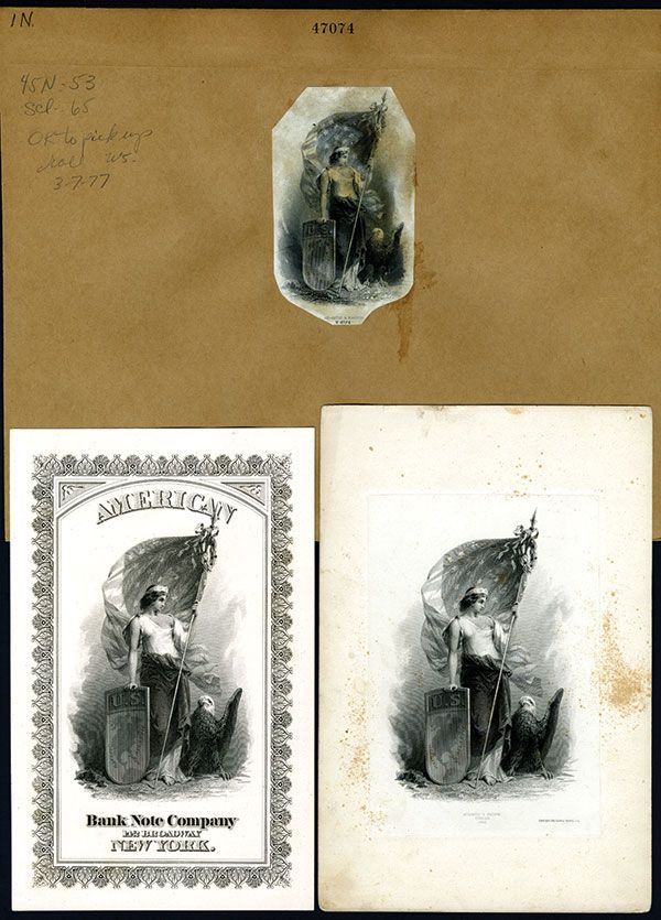 Lot of 3 items, Two are proof vignettes, one large and one small and one is an ABNC advertising piece or card, all are of the image of Standing Allegorical Woman with Flag, Shield & Eagle, Engraved by ABNC for Union Pacific Railroad Company. The Ad card is in XF condition, the LDP is in VF-XF and the Small die proof mounted on manila file folder has glue stains but is in Fine condition. Rare related Proof Vignette trio of famous and historic design. ABNC.