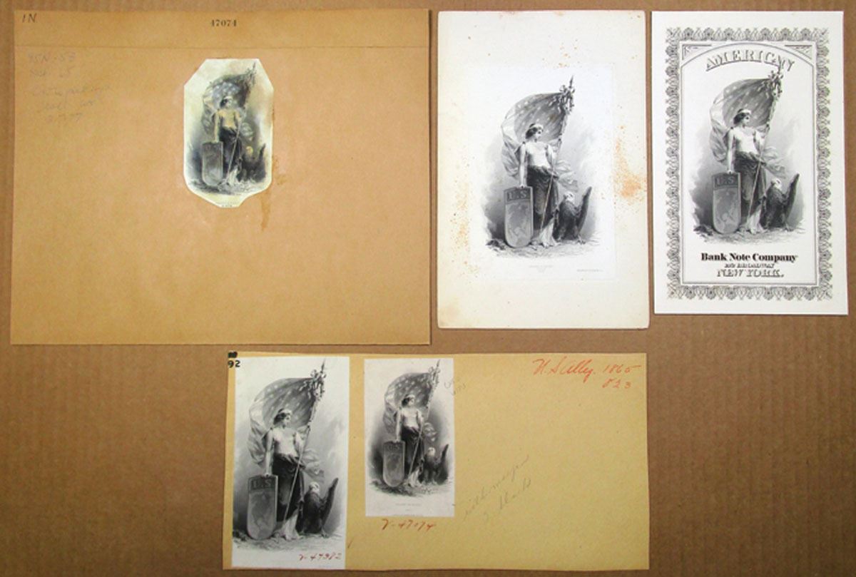 United States, ND (ca.1980-70). Lot of 4 Items with 5 Vignettes of "Atlantic & Pacific" printed by ABNC, 2 are pasted onto same manilla card with notations, 1 is on large card with plate number 47074 at top, 1 is printed on India paper on white thin stock paper; and last is printed on ABNC advertising card. XF to Uncirculated condition. (4items with 5 proof vignettes). Used on the Union Pacific Stock and Bond certificates. Sold "AS IS" no returns accepted.