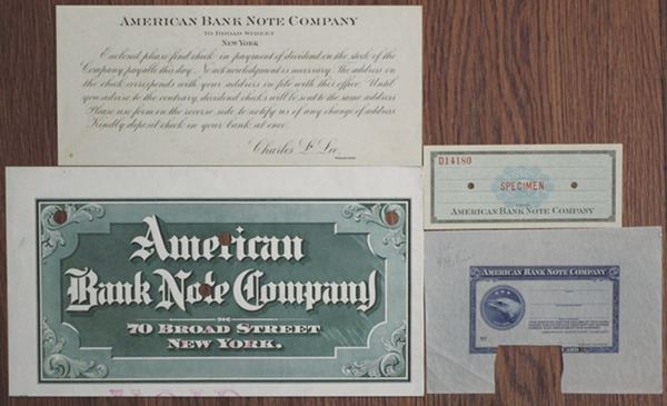 New York, Lot includes 4 pieces: 6 x 4 inch Proof Employee Identification Card intaglio printed on India paper; 5 x 2 inch Specimen coupon with blue background; 9 x 4 inch check payment from dividend stock boilerplate message; 10 x 5.5 inch intaglio ABNC header in green with POCs. 4 pieces.