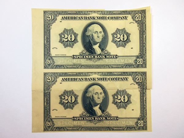 New York, Uncut Vertical Pair of notes, 20 denomination, George Washington in center, Black on yellow paper, Cut unevenly on top, 1 vertical and 1 horizontal fold keeps this pair of notes from AU condition. Rare variety, ABNC.